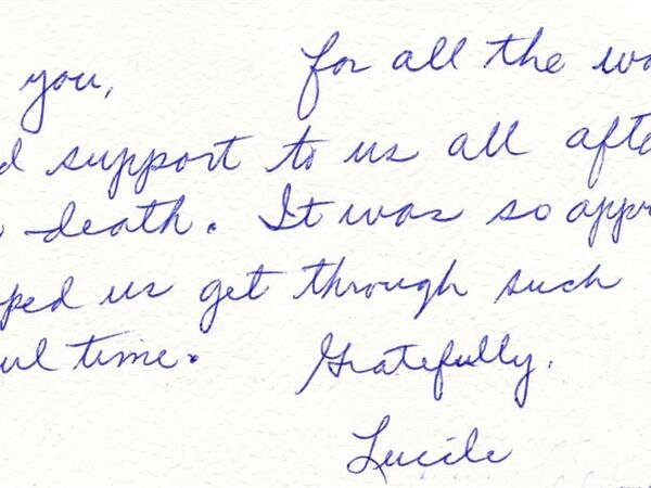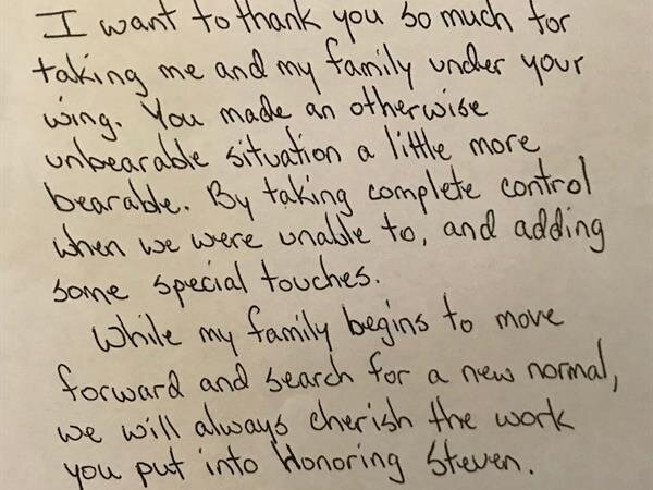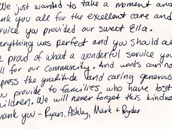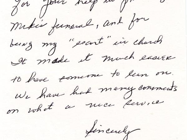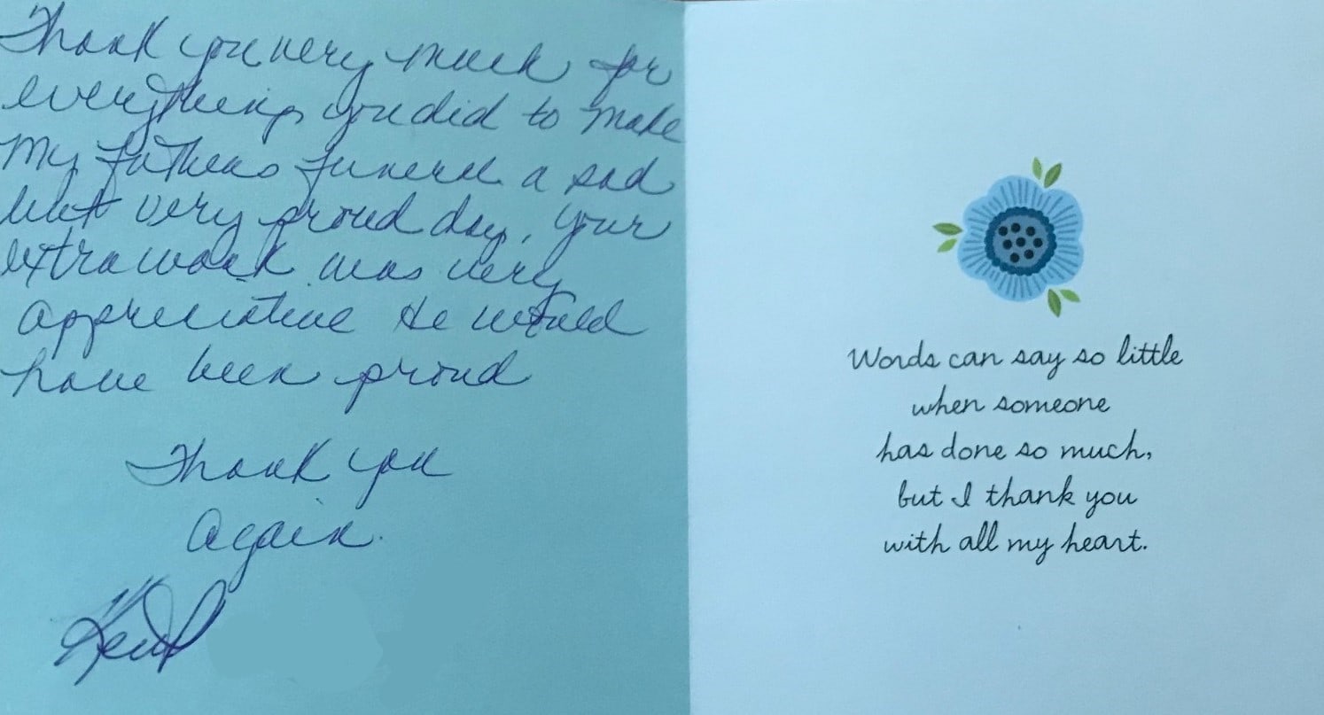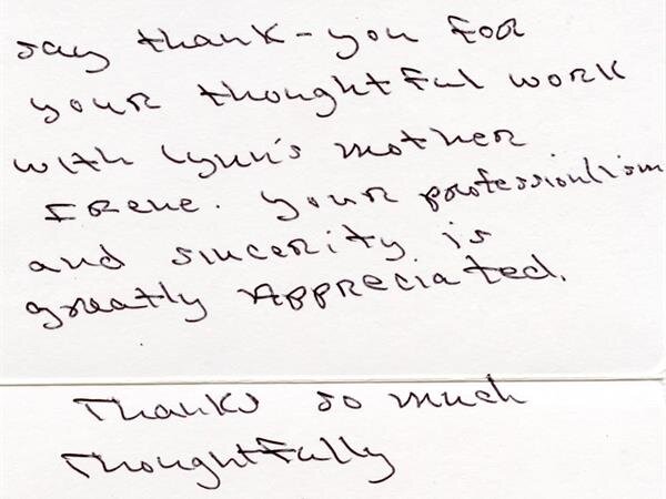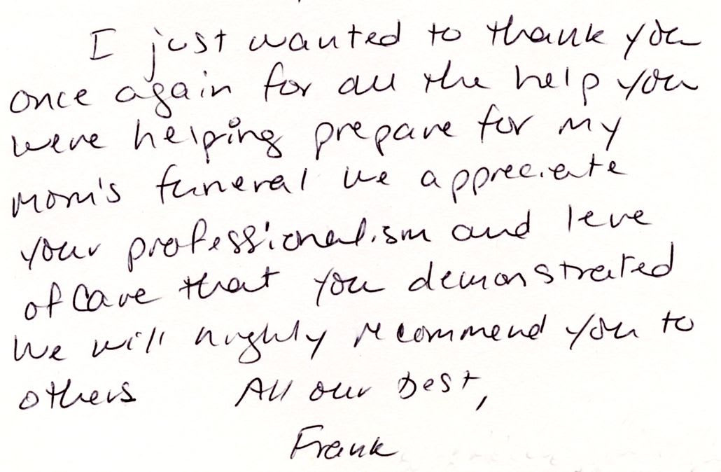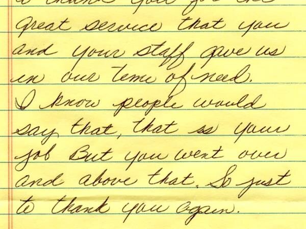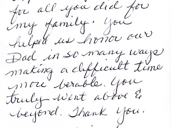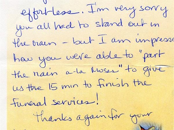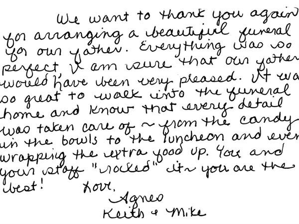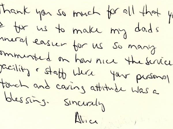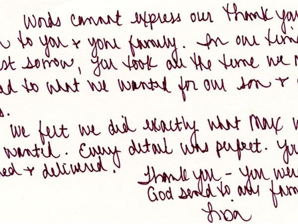We receive many letters from the families we've helped, thanking us for our caring ways during their time of loss. Their words warm our hearts, and speak to you of our professionalism, compassion, and the true value of the services we provide. We have kindly removed the last names for online privacy.