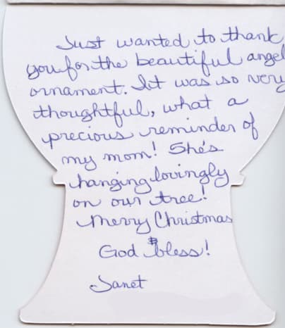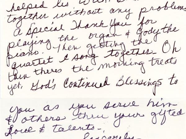 Thank you so much for the gentle care you took of our mother and us during our loss. It was very special to me that you accompanied my son, David while he sang. You truly are a servant of God.