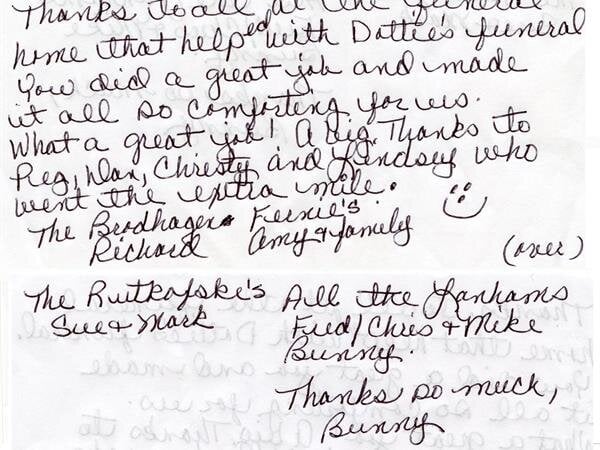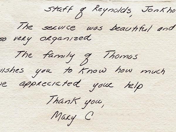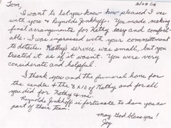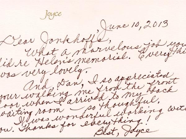 I wanted to thank you for helping our family through this most difficult time with my Mom's death a couple weeks ago. Our entire family thought everything was well done and yourself as well as the other people at Reynolds-Jonkhoff were just outstanding.